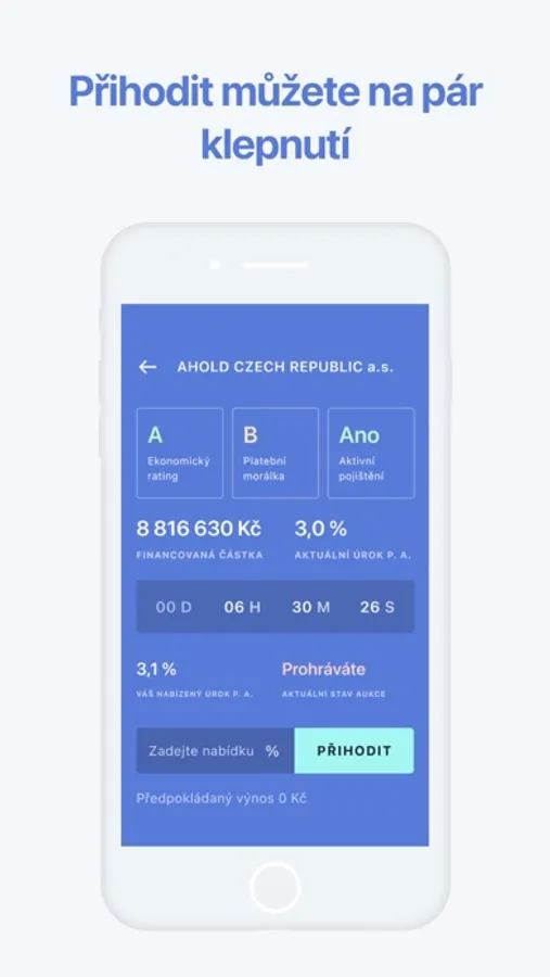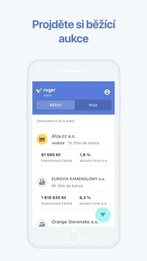 Prostřednictvím Roger Aukce investujte do faktur za bonitními společnostmi s průměrným úrokem 4,8 % p.a. K registraci potřebujete pouze dva doklady totožnosti a smlouvu o vedení účtu, případně výpis z bankovnictví. Po registraci vidíte přehled všech aukcí a faktur, kterých se můžete zúčastnit formou bidování úroků. Teď už jen stačí vybrat investici podle vašich preferencí a mít ji všude s sebou.