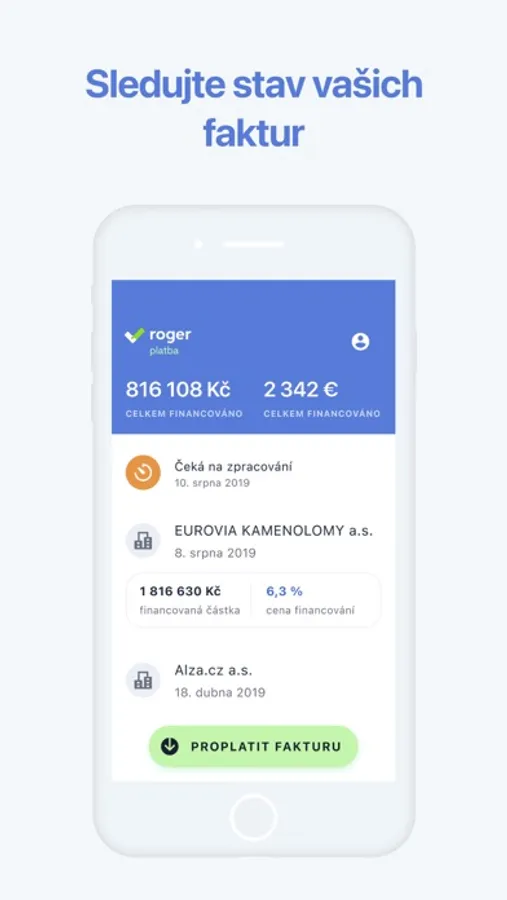 Roger Platba vám zkrátí dlouhé splatnosti faktur na 3 dny. Nečekejte až vám odběratel zaplatí. Jednoduše vyfoťte fakturu a zašlete ji přes aplikaci Rogerovi k profinancování nebo jen jako nezávaznou poptávku. Do 3 dnů obdržíte 75 % z faktury, zbytek po zaplacení odběratelem. Žádné skryté poplatky, podmínky financování znáte předem.