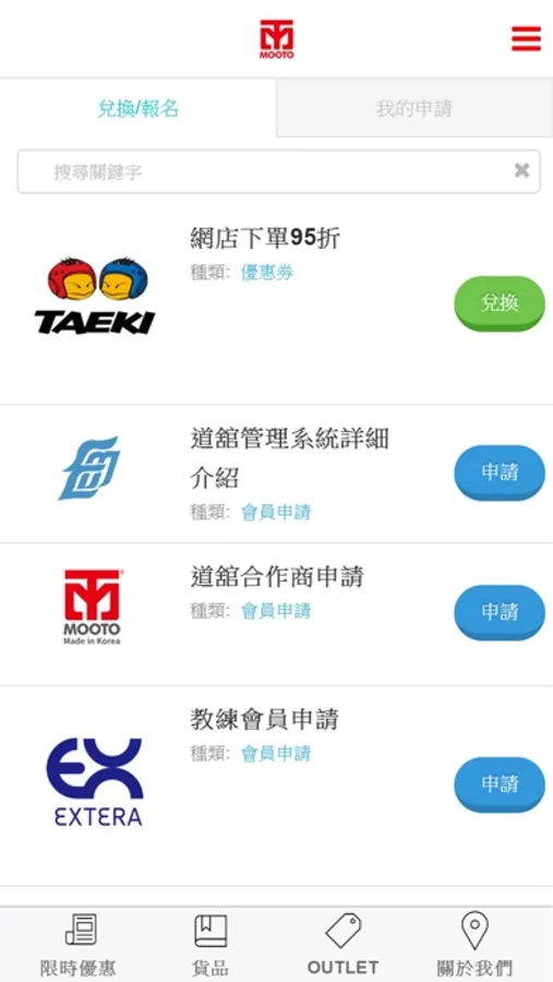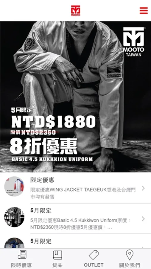 MOOTO 為韓國知名武術用品品牌,是WT認可的指定品牌之一,為全世界提供專業的跆拳道產品,包括:跆拳道道袍,訓練護具及裝備,道館場地設備及休閑服裝等。著重產品的品質和舒適度,追求產品與身體的同調,使運動員在運動其間能一直訓練與打破自身不足,達致精神與身體的完美結合。