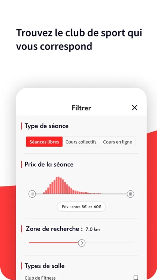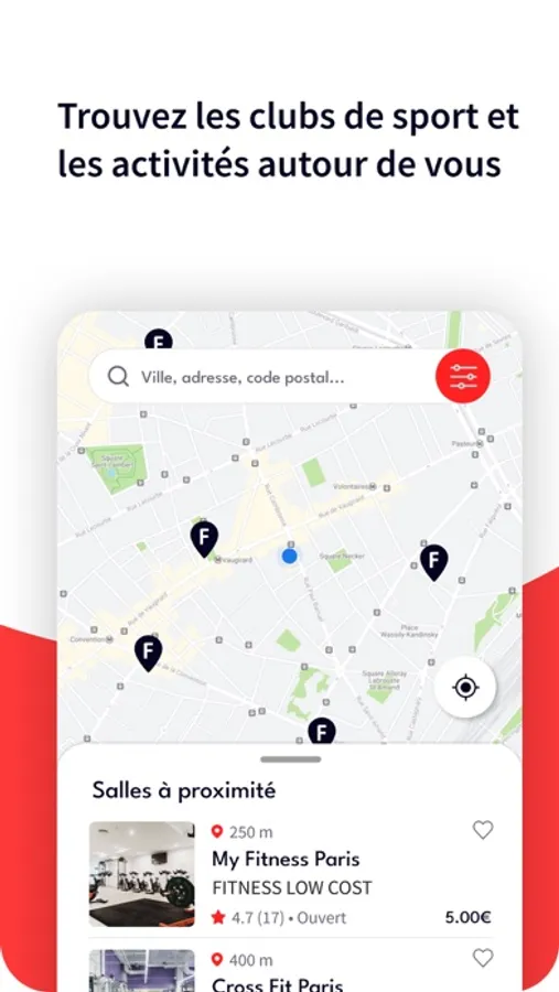 Un système de géolocalisation vous est proposé pour localiser les clubs autour de vous dans un rayon de 50km. Vous pourrez alors réserver votre séance de sport en quelques clics et pratiquer où vous voulez et quand vous voulez.