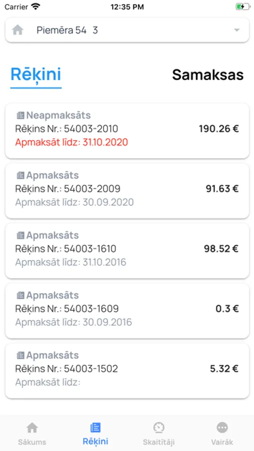 * RĒĶINI – iespēja apskatīt un/vai lejuplādēt jebkuru no 12 pēdējiem rēķiniem;