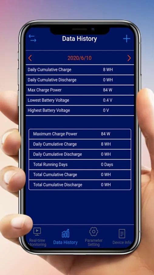 We have 4 main pages for this APP. The first page is for displaying the status of the system, the 2nd page is for displaying the historical data, the 3rd page is for displaying the parameters for settings, and the last one is for displaying the device information. Except for showing the present system information, we also can set the parameters for the charge controllers in the parameter setting pages, like for battery type, battery charge & discharge voltages, load mode settings and etc. The default password for setting page is 123456.