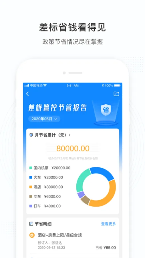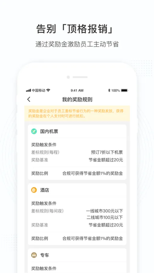 3.差旅标准设置:系统可以设置各级别人员相应的差旅消费标准,预设超额差标费用风控阈值。员工在预订时自动匹配差标,超过后系统可预警,助您轻松降低差旅支出成本;