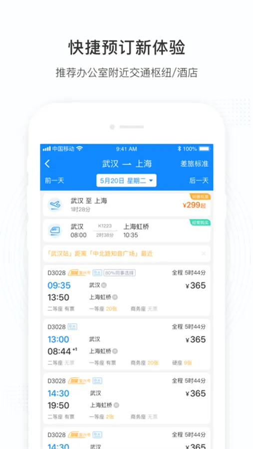 火车票:同步12306官网直连信息,价格票源实时准确有保证。可在线选择席别,全力保证当天出行当天有票,满足紧急出差需求;