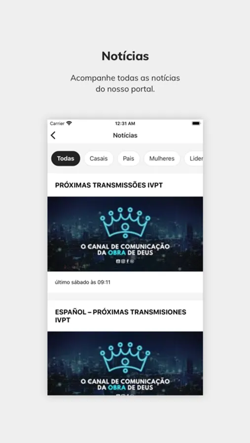 O aplicativo oficial do IVPT traz para você as novidades do nosso portal oficial, do Mensagens das Conferências, dos sites das regiões, do nosso canal do Youtube e demais redes sociais. Aqui você encontrará:
