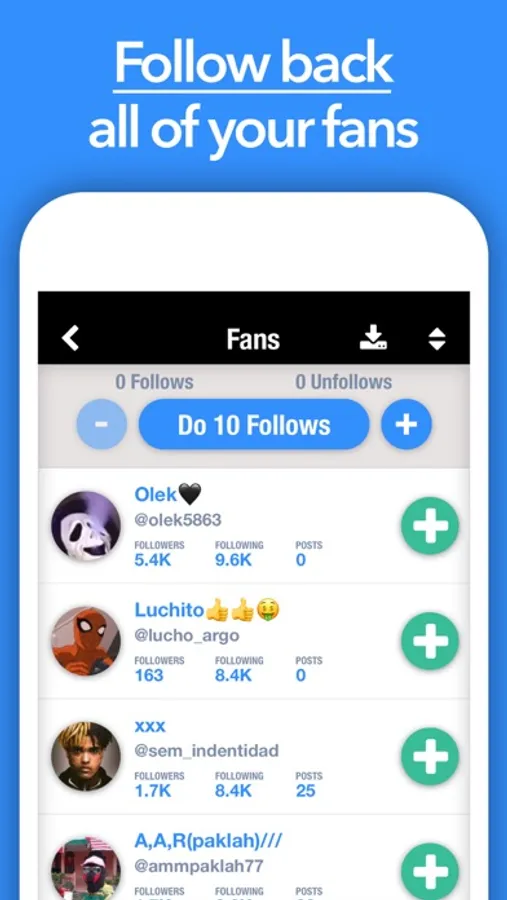 And then smart management! Follow back the good fans and unfollow who is not following back... with just one click! Give up wasting your time...