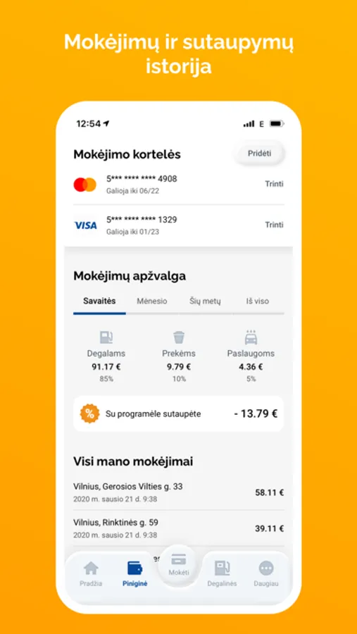 Mobiliojoje programėlėje visada rasite savo pirkimų istoriją kur ir kiek pylėtės degalų ar pirkote prekių.