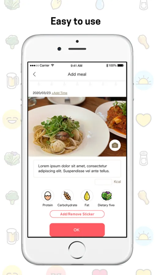Are you consuming high calorie food? Then put on a 'high calorie sticker' on it. Express your emotion straight away with 65 stickers that have various keywords such as 5 major nutrients, various food, your mood, and time.