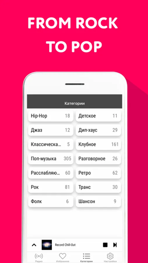To help you navigate through the diversity of stations, the application is divided into 14 categories (Rock, Club, Deep House, Chanson, Trans, Pop, Retro, Relax, Hip-Hop and Rap, Conversational, Folk, Classic, Jazz, Kids). There is also an easy transition between the radio of the selected category when listening to it.