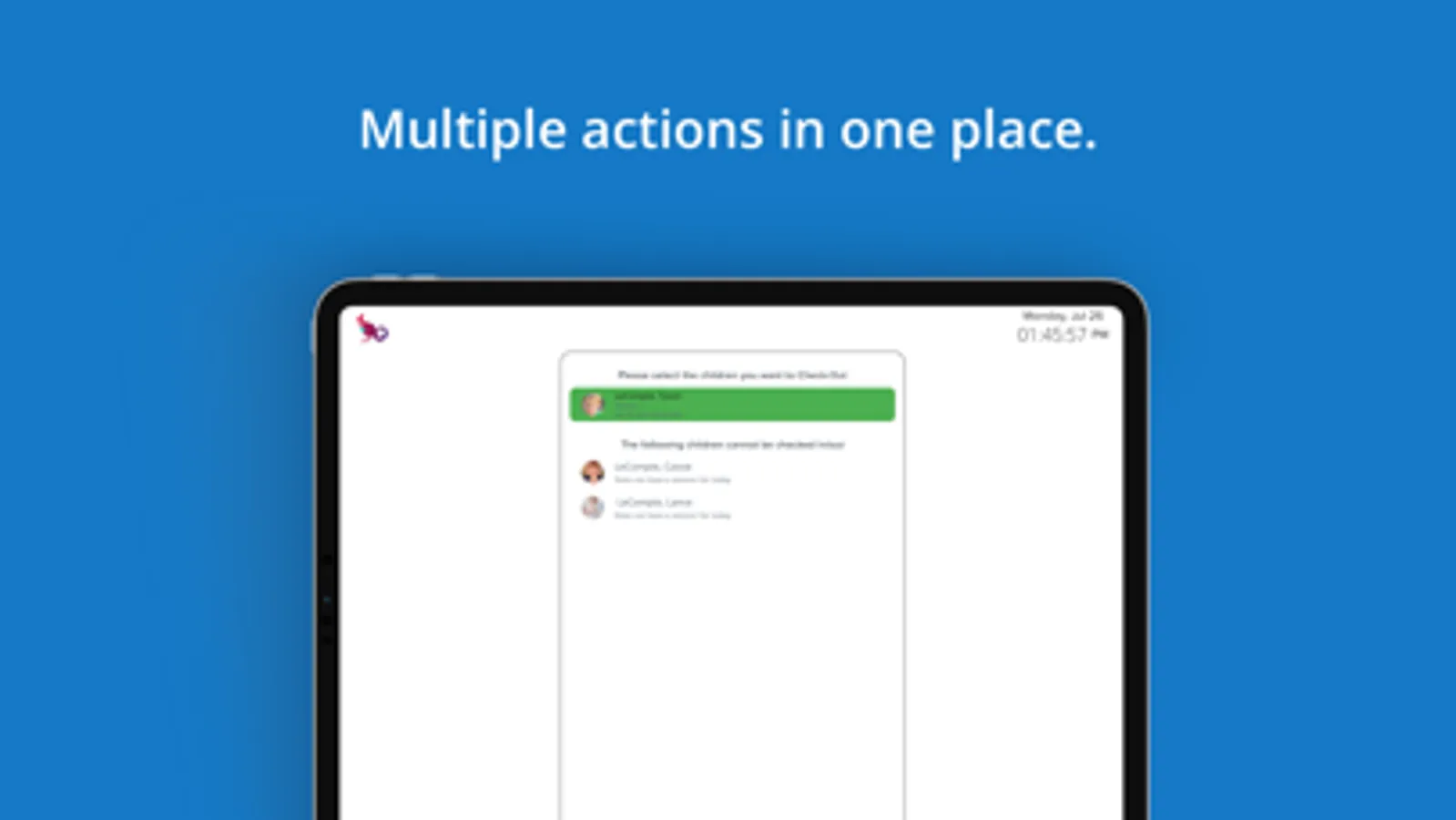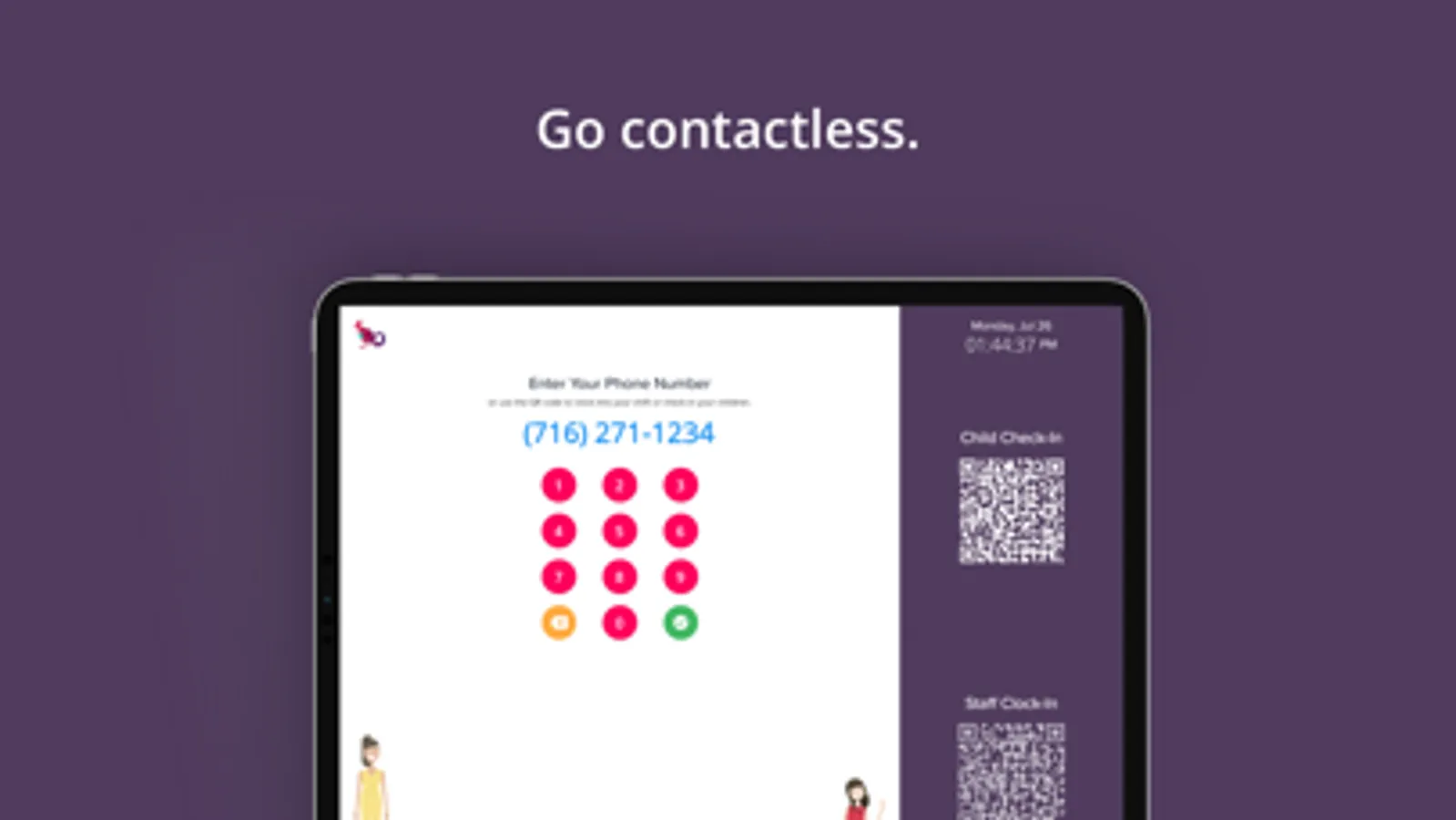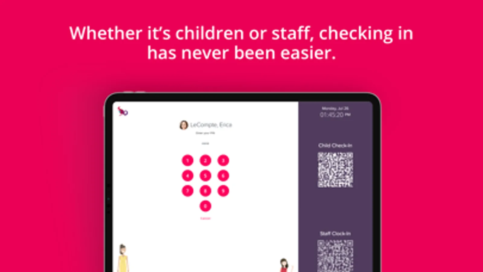 Kangarootime's Kiosk is a time clock for users. Children can be checked in and out, creating a secure and official record of their time at your center. Employees can clock in and out for their shifts and breaks creating an official time worked record. Your view will be based on your subscription level.