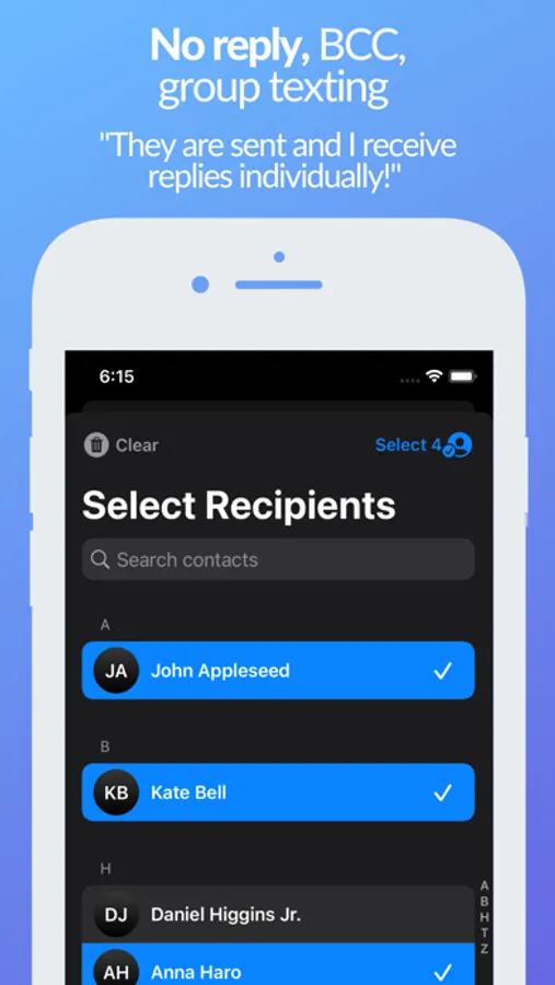 - No reply, BCC group texting, so only your recipient will see who got your text, just like BCC email. Replies will come to only you!