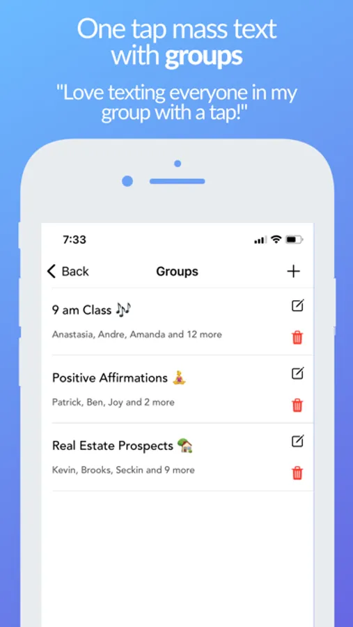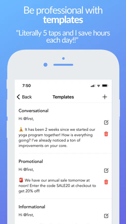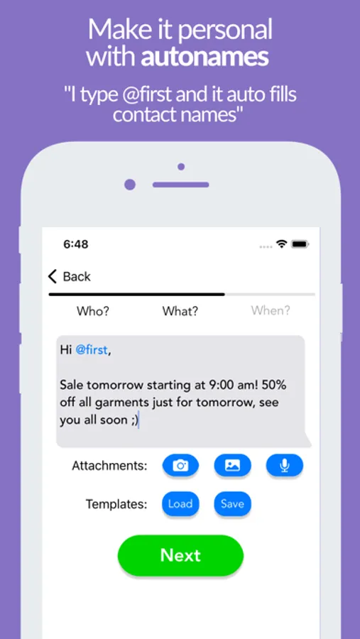 • Personalize texts easily by replacing first and last names automatically from your contact book.