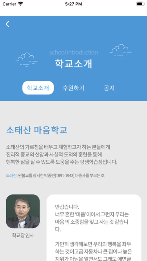마음학교만이 가지고 있는 소태산의 소박한 마음공부를 통해 나와 너, 나와 풀 한 포기, 우주만유가 소중한 은(恩)의 관계임을 깨달아 마음의 힘과 지혜와 실천력을 기르는 방법을 체험하도록 도와 드리고자 합니다. 시작은 미미하지만 노력과 정성을 더해서 훌륭한 평생학습 시스템으로 가꿔나가고자 합니다. 관심과 성원을 부탁드립니다.