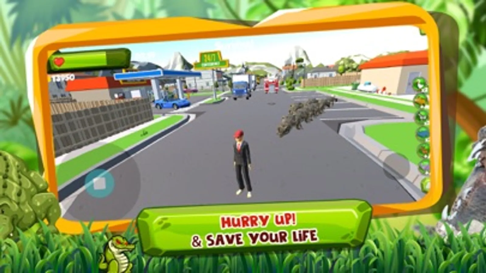 CHASE level: You must follow the arrow to go thru all checkpoints to beat the level while escaping and surviving from the alligator(s).