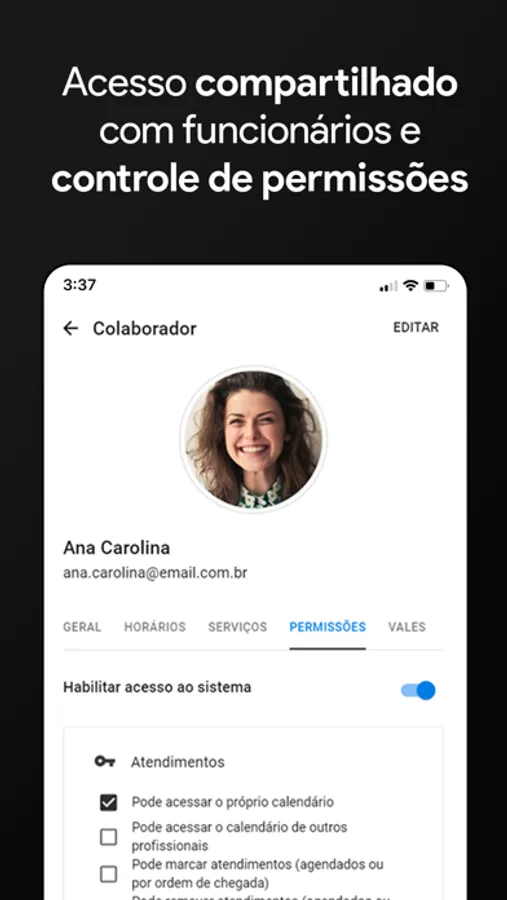 - Permissões: Defina o que cada colaborador pode ver ou fazer. Configure mais de 50 regras de acesso e permissões.