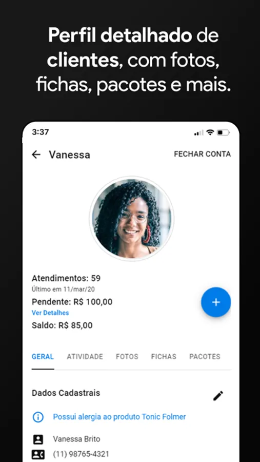 - Clientes: Cadastro de clientes completo, com histórios de serviços e venda, pacotes, fotos, fichas e mais.