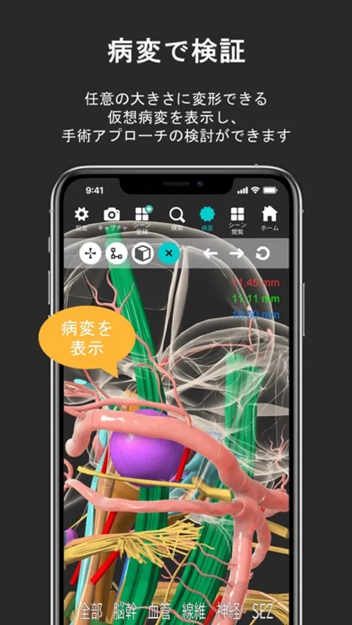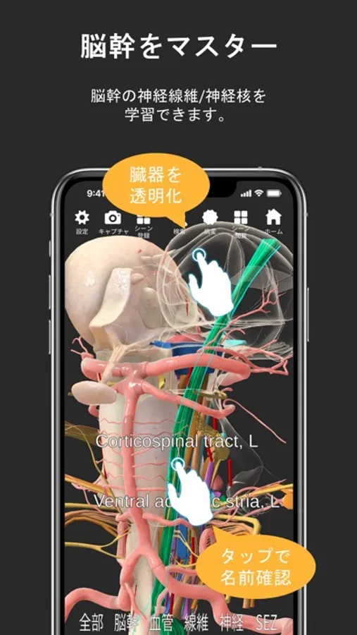 画面のドラッグやピンチで回転や拡大/縮小表示し、また解剖構造をタップして半透明/透明表示させ、内部の神経線維、神経核を表示します。