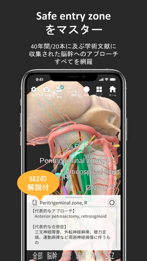 SEZをタップすることで重要な関連構造をハイライトし、代表的な手術アプローチ、合併症、そして文献から収集された関連情報を引用文献と共に表示します。