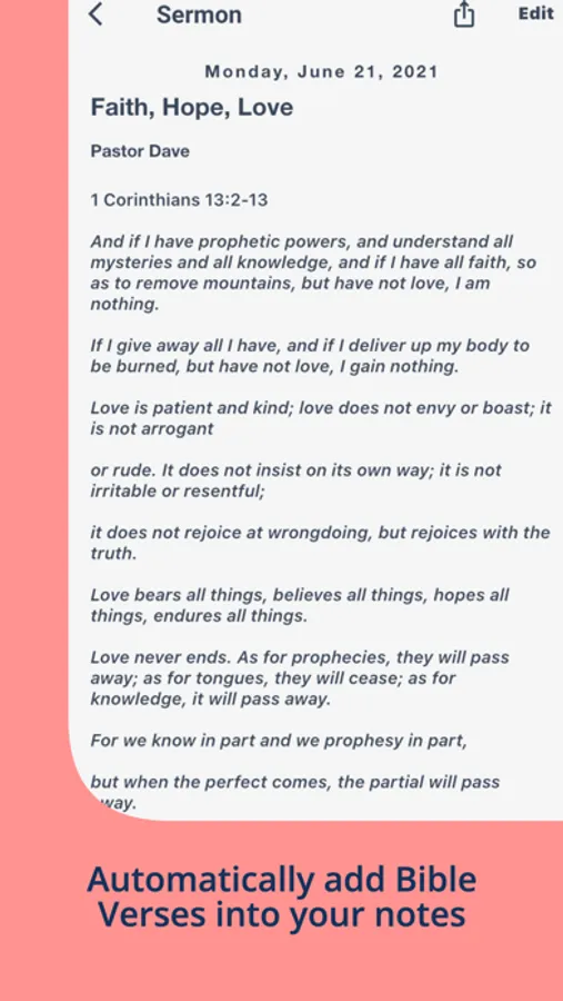 * Auto-Verse: Type in a Bible Verse, tap space, and that verse will automatically be inserted into your note