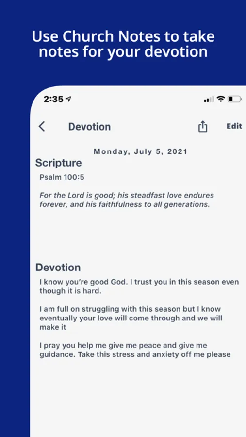 * Devotions: Create Daily Devotions with Church Notes. Type out a verse, and write down some thoughts around that verse. It even comes with SOAP, which allows you to structure your Devotion.