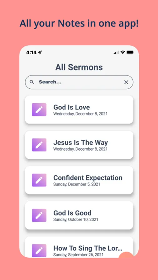 * Sermons - Create detailed notes while listening to a Sermon. Type in the Sermon Title, Preachers name and take word for word, verse for verse notes of that sermon.