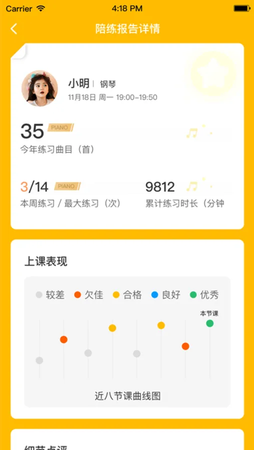 4、提出课程要求:可以提出课程要求,比如说希望练习某个曲目或听讲某个知识点,提出课程要求的方式可以是音频,也可以是文字。此外,可以看到助教教师和学生提出的课程要求,以便学生能提前准备。