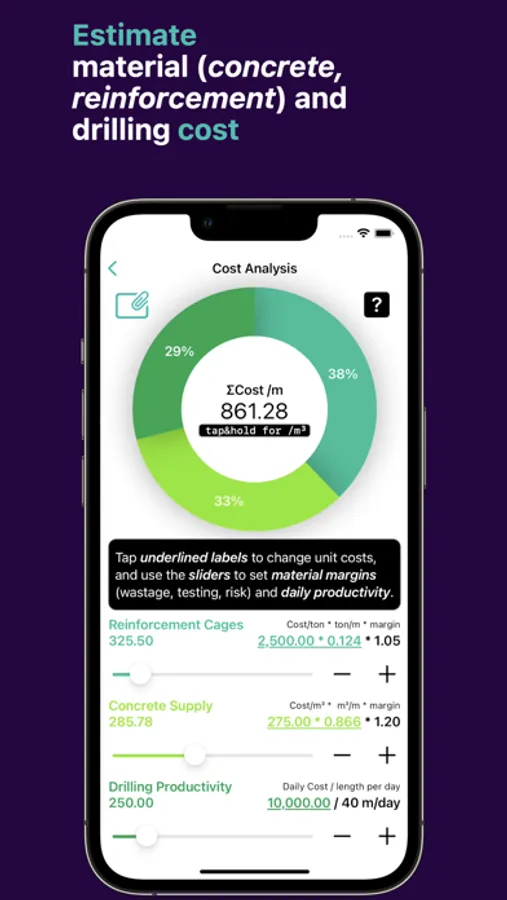 * Estimate material (concrete, reinforcement) and drilling cost.