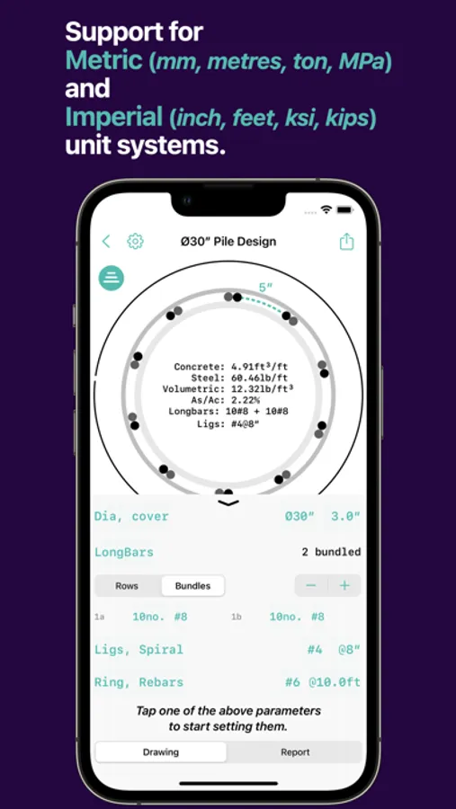 * Support for both Metric (mm, metres, ton, MPa) and Imperial (inch, feet, ksi, kips) unit systems.