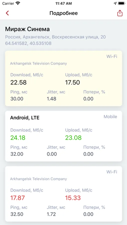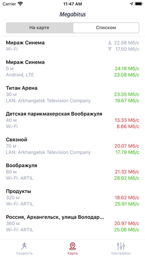 Пользователи «Мегабитус» могут сравнивать полученные результаты с результатами по другим операторам, полученным в этом же месте. Можно определить самого быстрого оператора в вашем доме или офисе. Такой возможности нет у других сервисов!