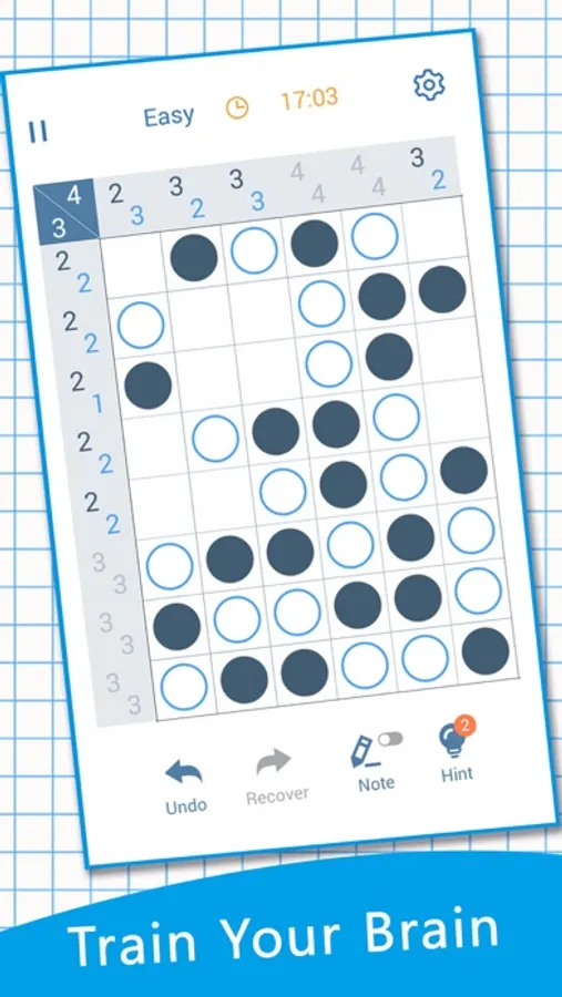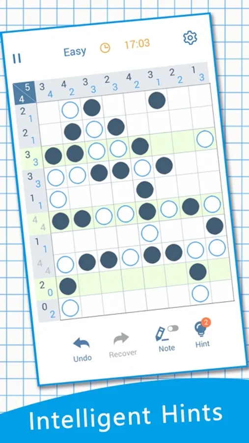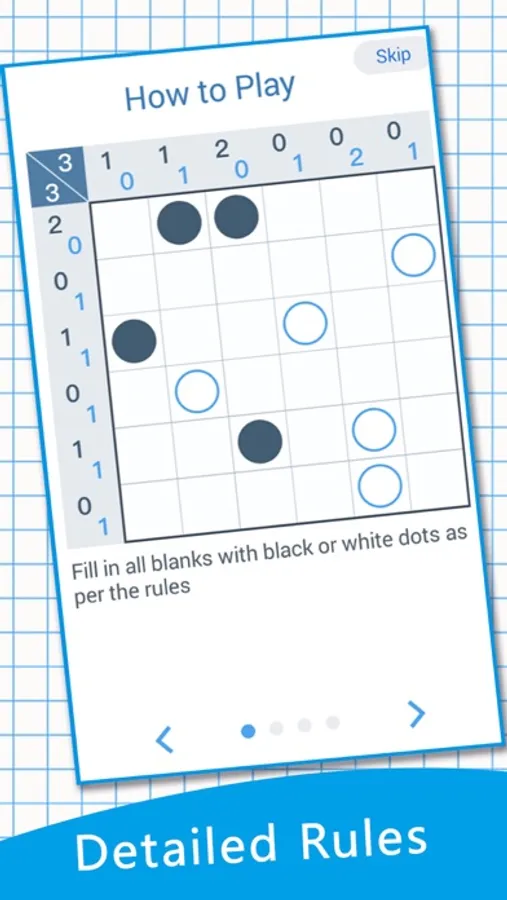 The puzzle is composed of cells with different difficulties corresponding to different cells. The goal of the game is to fill the cells with black and white dots and meet the following three requirements: