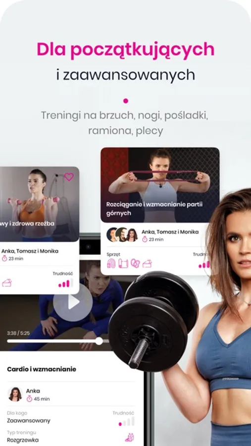 • Treningi na różne partie ciała razem z rozgrzewką i rozciąganiem.