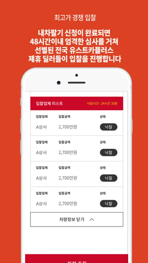 내차팔기 신청이 완료되면 48시간이내 엄격한 심사를 거쳐 선별된 전국 유스트카플러스 제휴 딜러들이 입찰을 진행합니다
