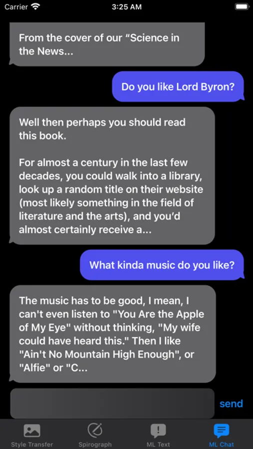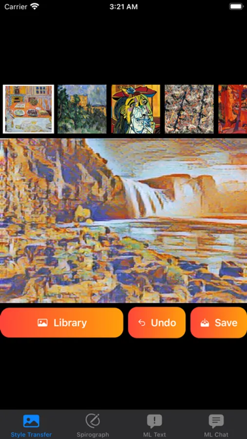 This uses neural network to transfer image style of the original to the desired one. Added Spirograph to doodle on, and Machine Learning text generator and chat bot for fun.