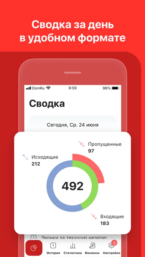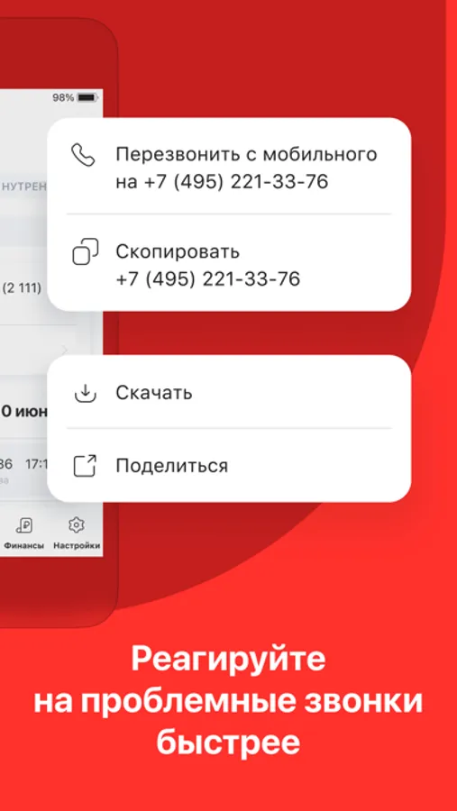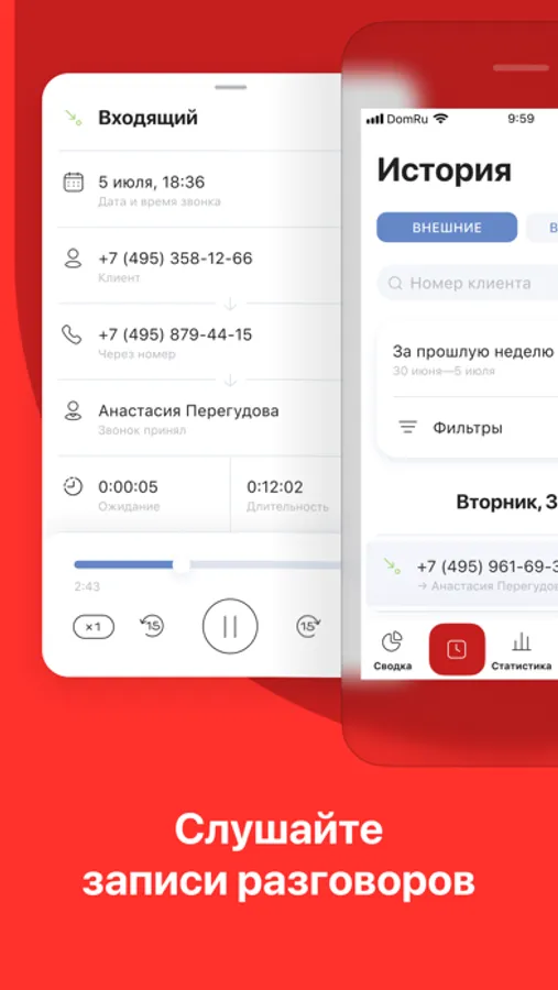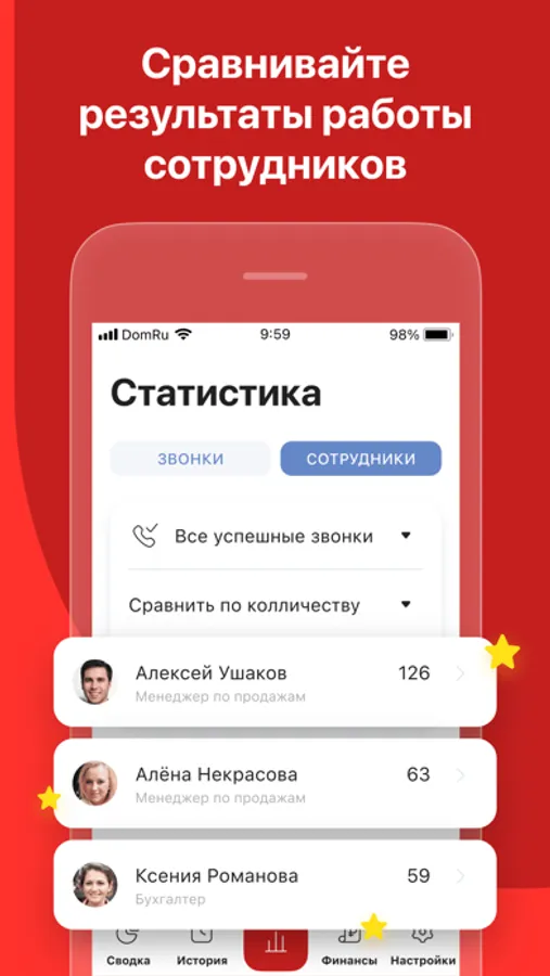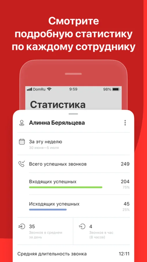С помощью Облачной АТС Дом.руБизнес вы можете организовать прием звонков от ваших клиентов на единый многоканальный номер, распределять звонки по сотрудникам, собирать аналитику по звонкам в компанию, оценивать эффективность работы сотрудников и сравнивать их друг с другом.