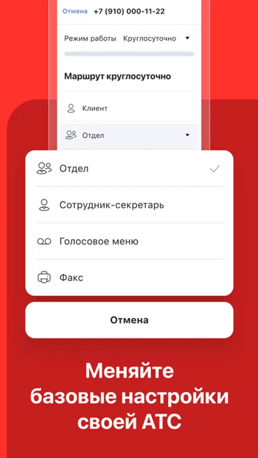 - Добавление и редактирование данных сотрудников, настройка переадресации.