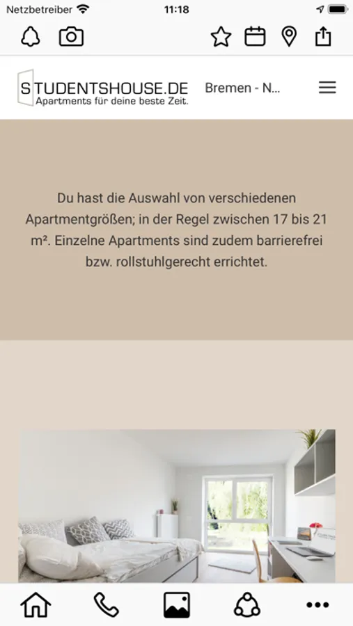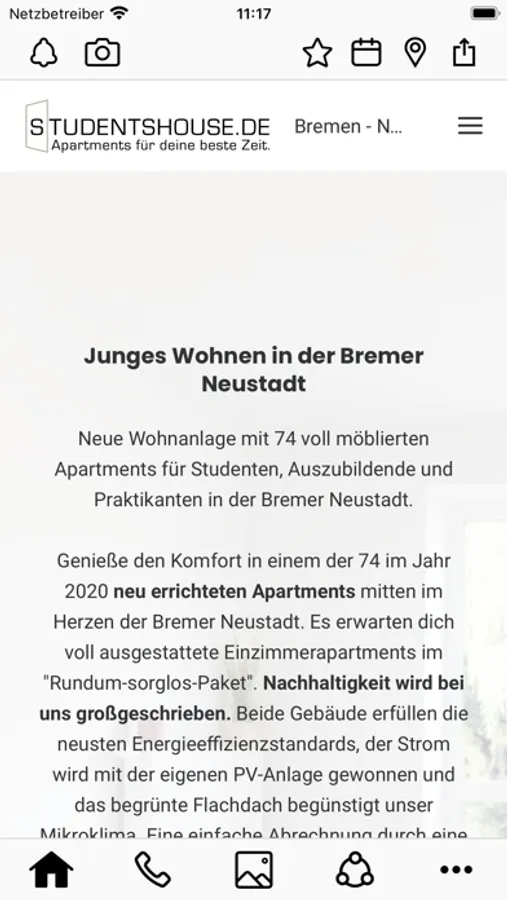 Studentshouse.de ist eine neue Wohnanlage mit 74 voll möblierten Apartments für Studenten, Auszubildende und Praktikanten in der Bremer Neustadt. Mit der Studentshouse App hast Du Zugriff auf umfangreiche Informationen, bleibst auch unterwegs mit uns in Kontakt und kannst innerhalb der Anlage unsere Facility Management Services nutzen: