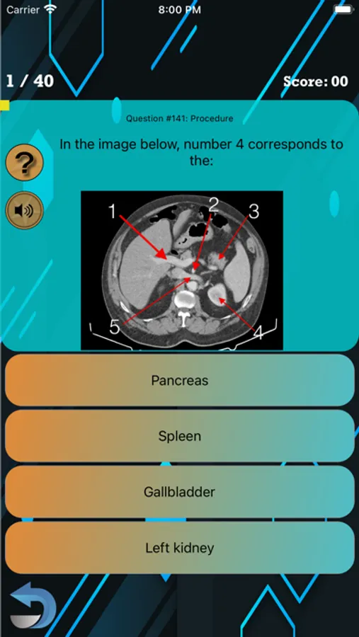 A test section to test your knowledge in a random order, as similar as possible to the ARRT® examination. It allows user to know if the correct answer was selected and if not a pop-up button will appear with access to the correct answer's explanation.