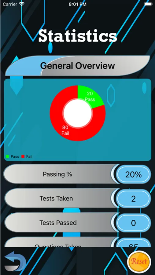 A Statistics section that help the user to keep track of all the statistics such as general score, number of questions taken, number of tests taken, and much more.