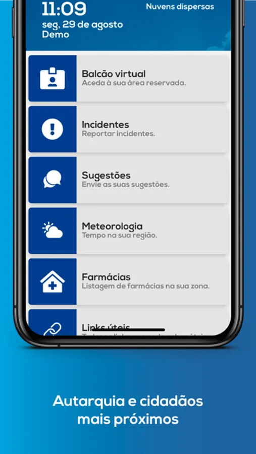 Esta aplicação permite aos utilizadores denunciar problemas detetados na via pública e enviar sugestões para a sua autarquia.