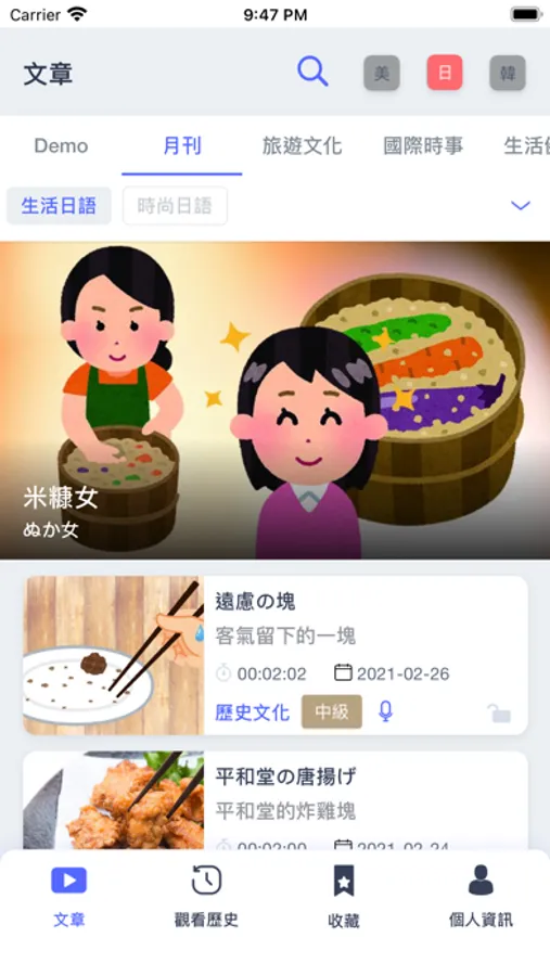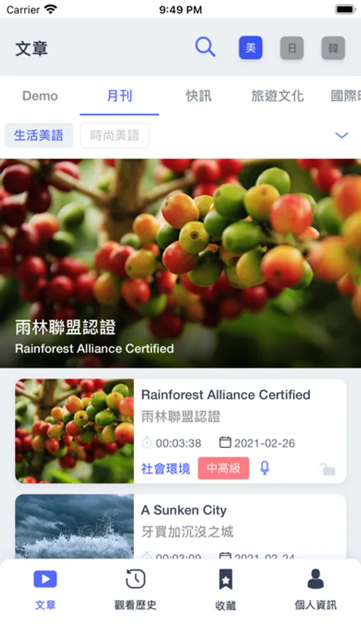 地球村愛學習提供文章的音視頻學習,有各種特色的文章,包含地球村時尚美語月刊,地球村生活美語月刊,地球村生活日語月刊,地球村新聞美語等專業老師編輯的文章供學員學習