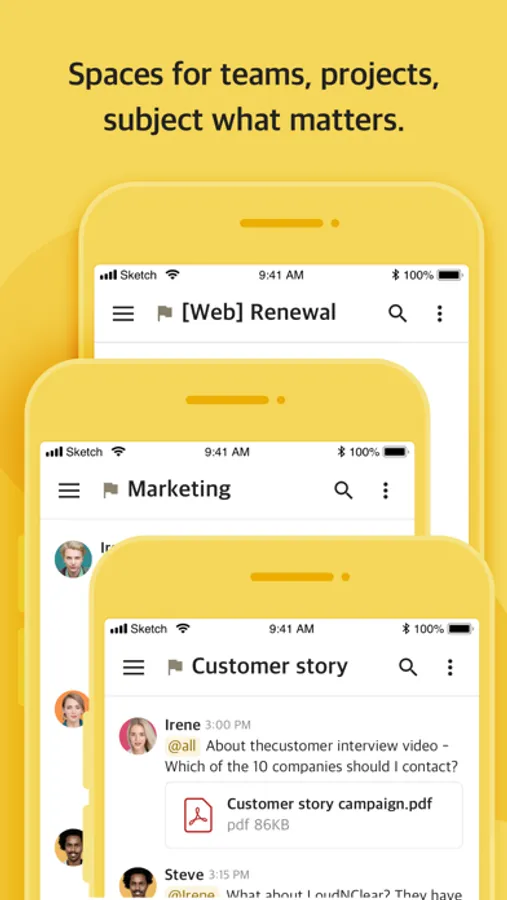 When you already signed up 'Collabee App' which is a team collaboration tool, all spaces in 'Collabee Messenger' automatically will be synced with spaces created on 'Collabee App'. You can continue to make a conversation on the same space with same colleagues. You can also manage 1:1 chat and group chat.