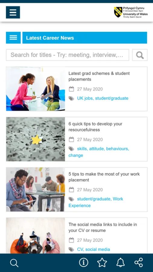 Everything you do in the app is in sync with your UWTSD Career Centre account and you always have access to the latest career tools, news and resources.
