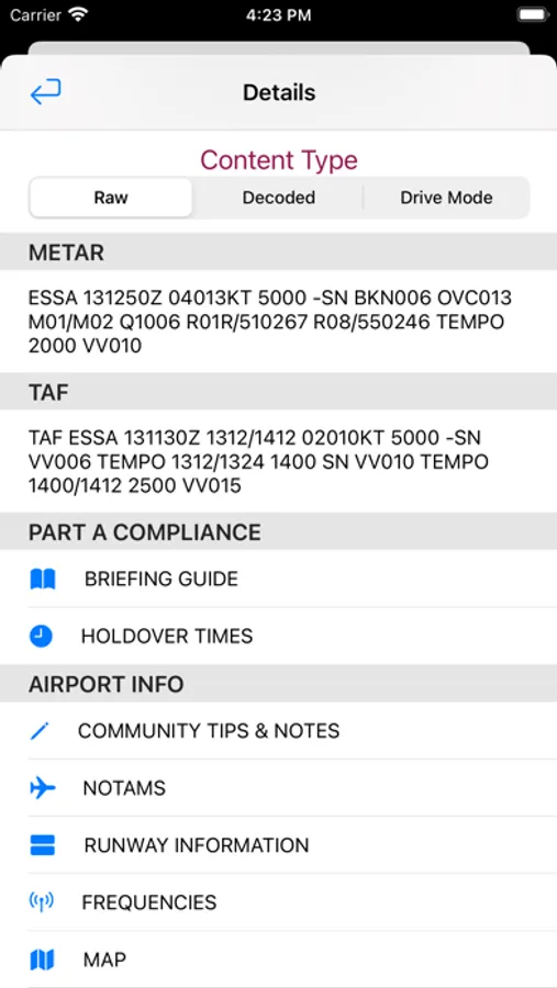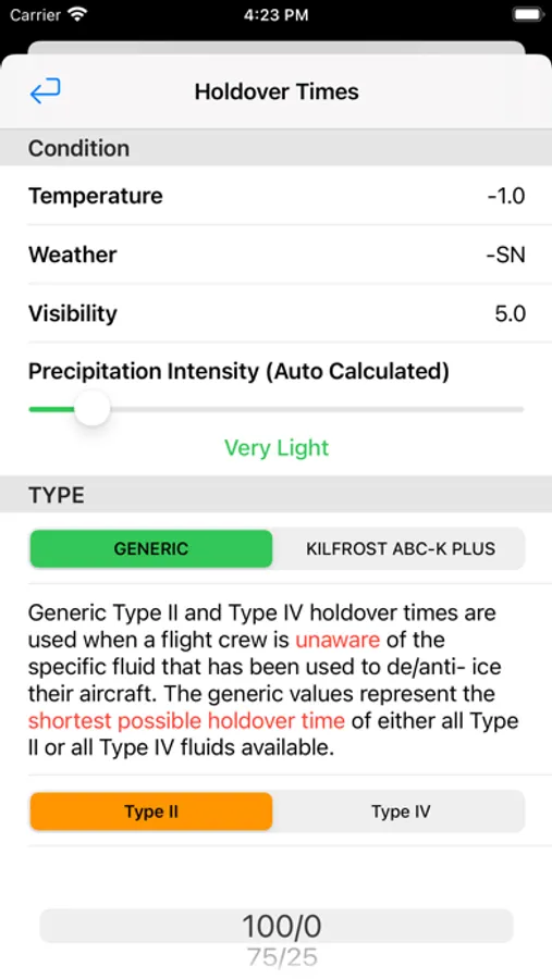 16- Holdover Times calculated on Details Section of the app with current weather information reported for the airport. If you want, you can manually enter weather information and ATSU handles the rest.
