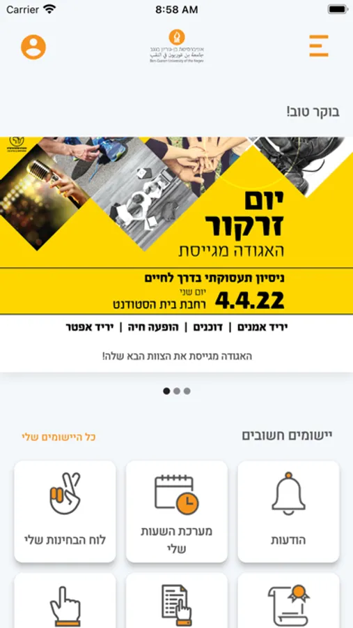 With the all new MyBGU Mobile app students can stay up to date with academic information such as course schedule, grades, tuition fees and exams' dates. The app also helps you to get updates and coupons from the Students' Association, digitally open service calls, register to hybrid courses, etc.