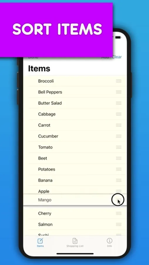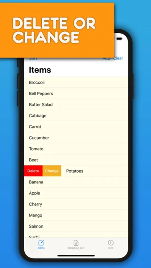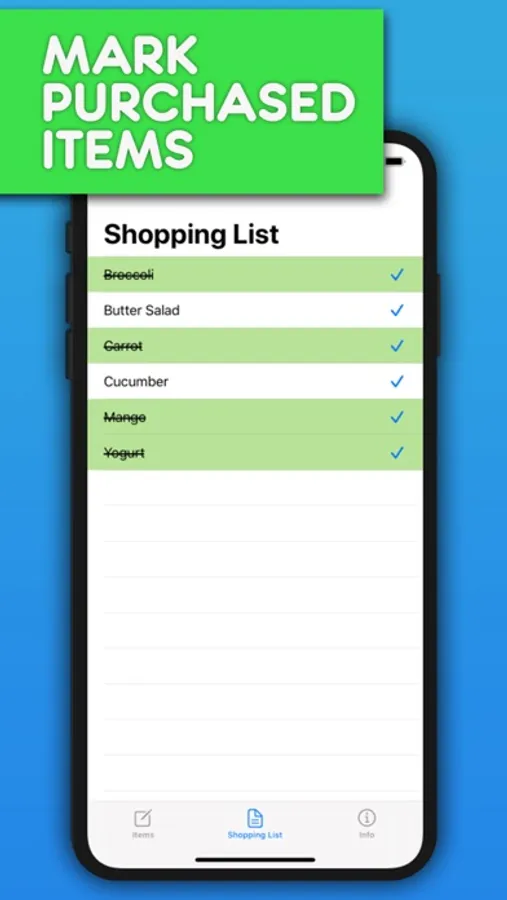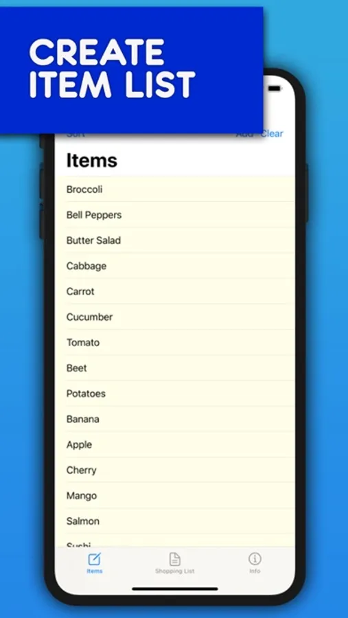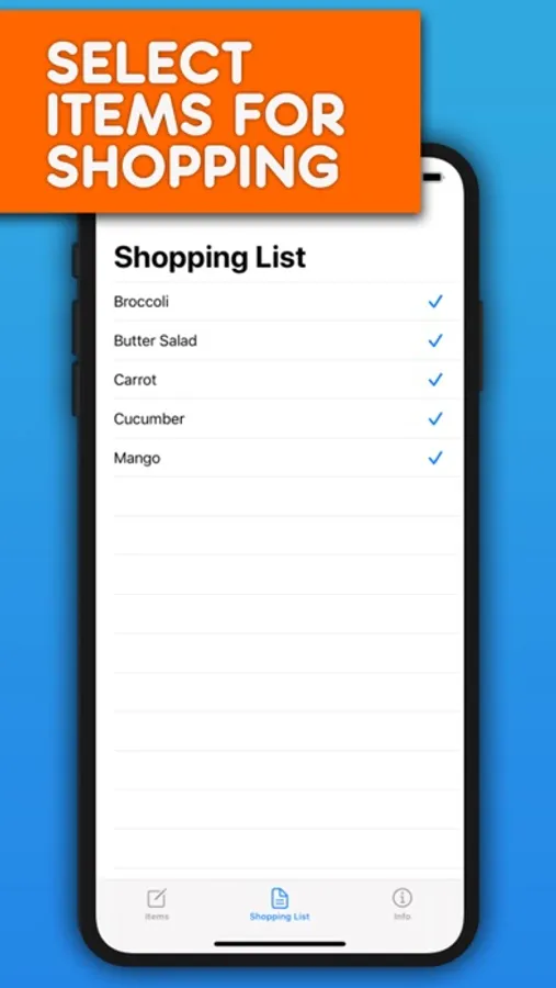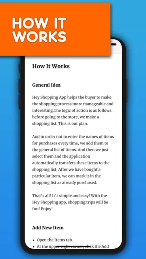 When we go to the store, it is convenient to make a shopping list beforehand. And in order not to print this list again every time, in the Hey Shopping app we make a general list of things that we can buy. And then we just select from this general list those items that we are going to buy today. After the item is purchased, we can cross it out in the shopping list.