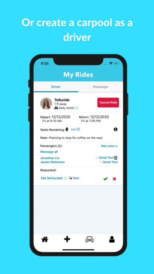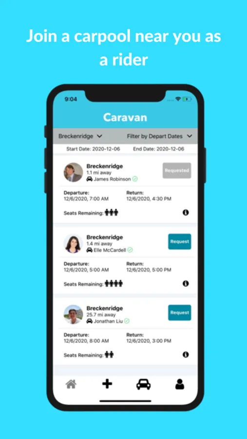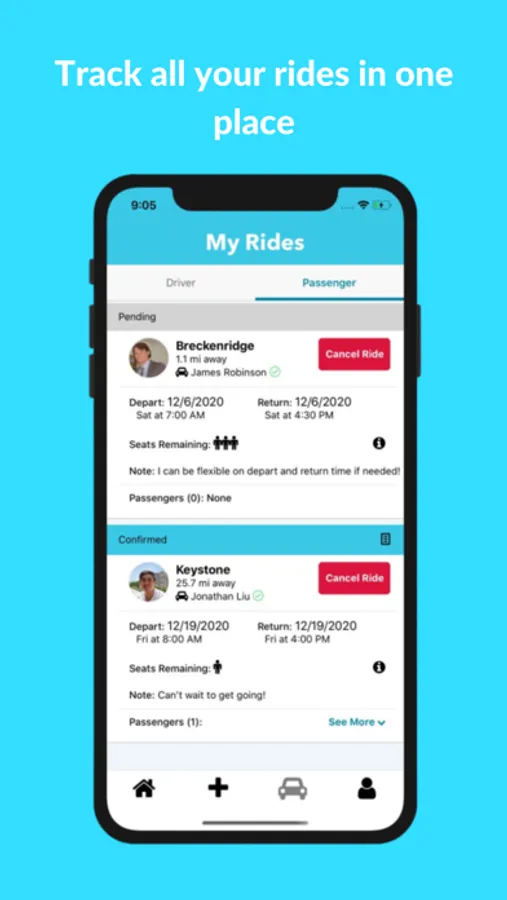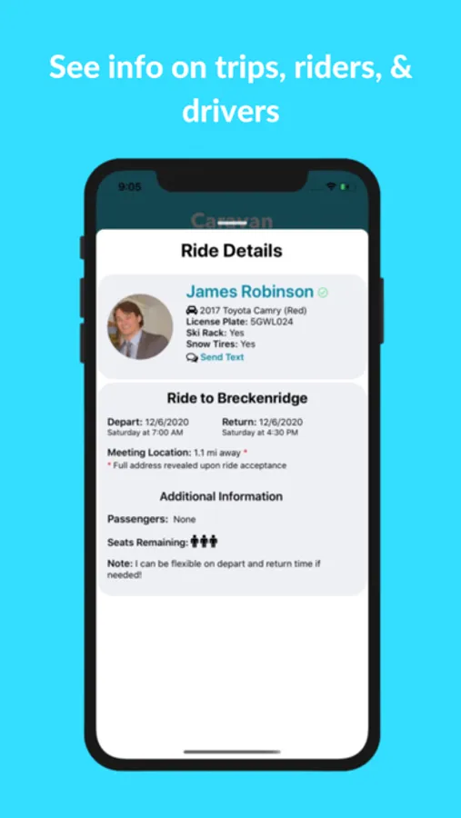 Whether a driver or a rider, Caravan connects you to the best rideshare option. You can post rides as a driver and choose who to accept into your carpool. Drivers include information about resort destination, date and time, and more trip details. Drivers can also add extra information about their car that riders may want to know.