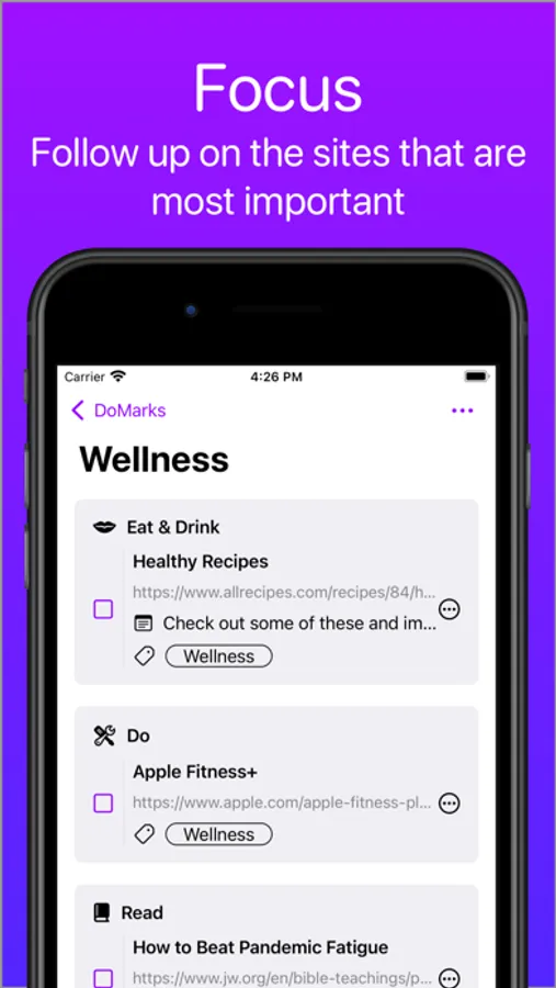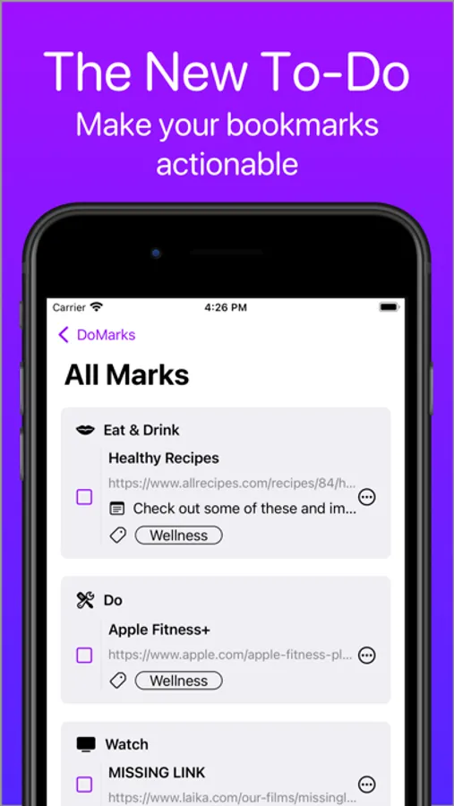 DoMarks is the to-do app for bookmarks. Add bookmarks. Categorize them. Check them off. Done!