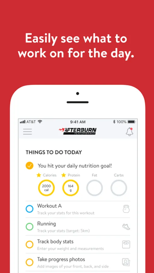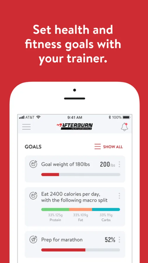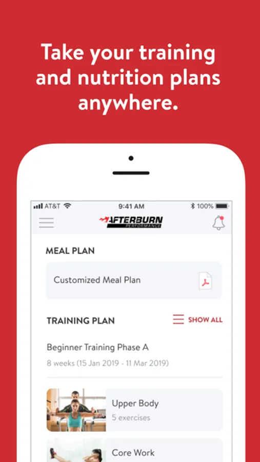 With the Afterburn Performance App, you can start tracking your workouts and meals, measuring results, and achieving your fitness goals, all with the help of your personal trainer.