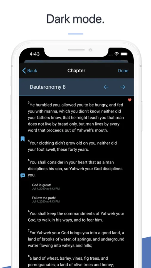- Bookmark any verse in the Bible so you can immediately jump to it and resume your reading.
