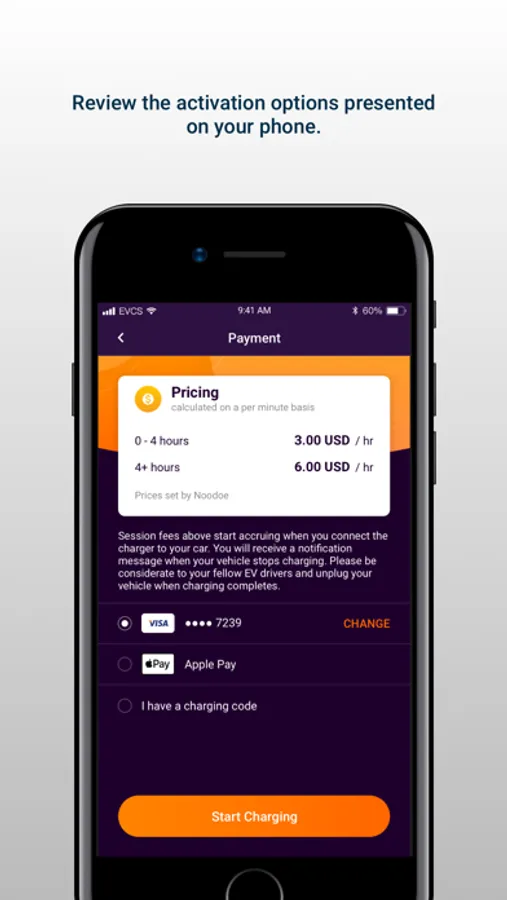 When charging your electric vehicle, use this app to scan the QR code shown on the EVCS charging station. The activation options will be presented on your phone. Simply follow the instructions on the phone to activate the EVCS charging station.
